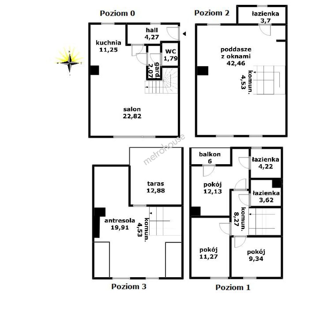 Nieruchomość położona jest na granicy dzielnicy Ochota i Włochy, na ogrodzonym osiedlu. Segment środkowy o pow 166,18mkw, w stanie deweloperskim, składa się z czterech kondygnacji: parter,piętro,poddasze użytkowe oraz zadaszona antresola z wyjściem na 13 mkw taras. Na tych powierzchniach rozmieszczono salon,kuchnię z oknem,trzy sypialnie,dwie łazienki, dwa WC,hol oraz ciągi komunikacyjne a także przestronne poddasze użytkowe i antresolę...