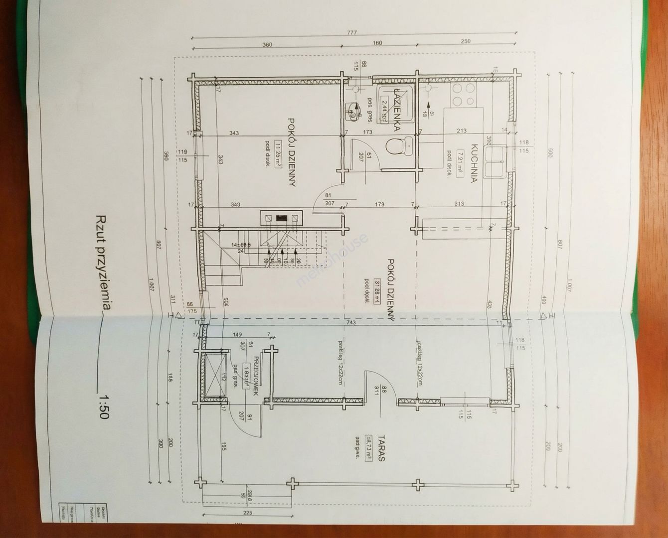 DÓŁ (56,24 m2): duży salon, kuchnia, łazienka, pokój.