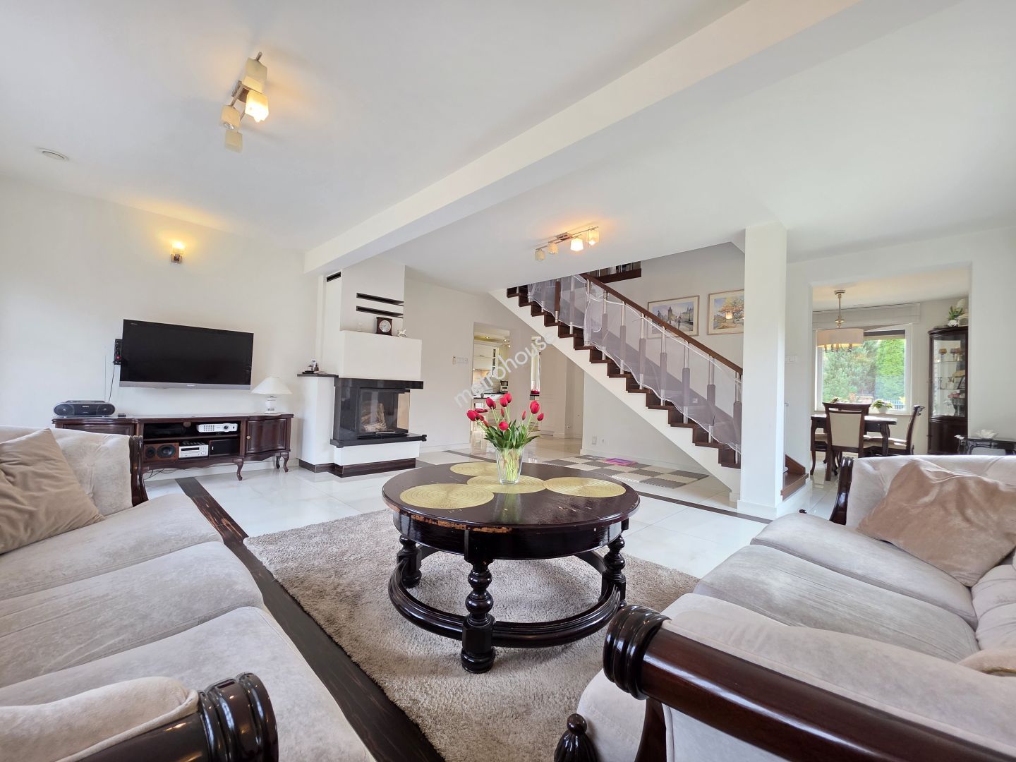 -Przestronny, otwarty salon z kominkiem i wyjściem na taras/podwórko.