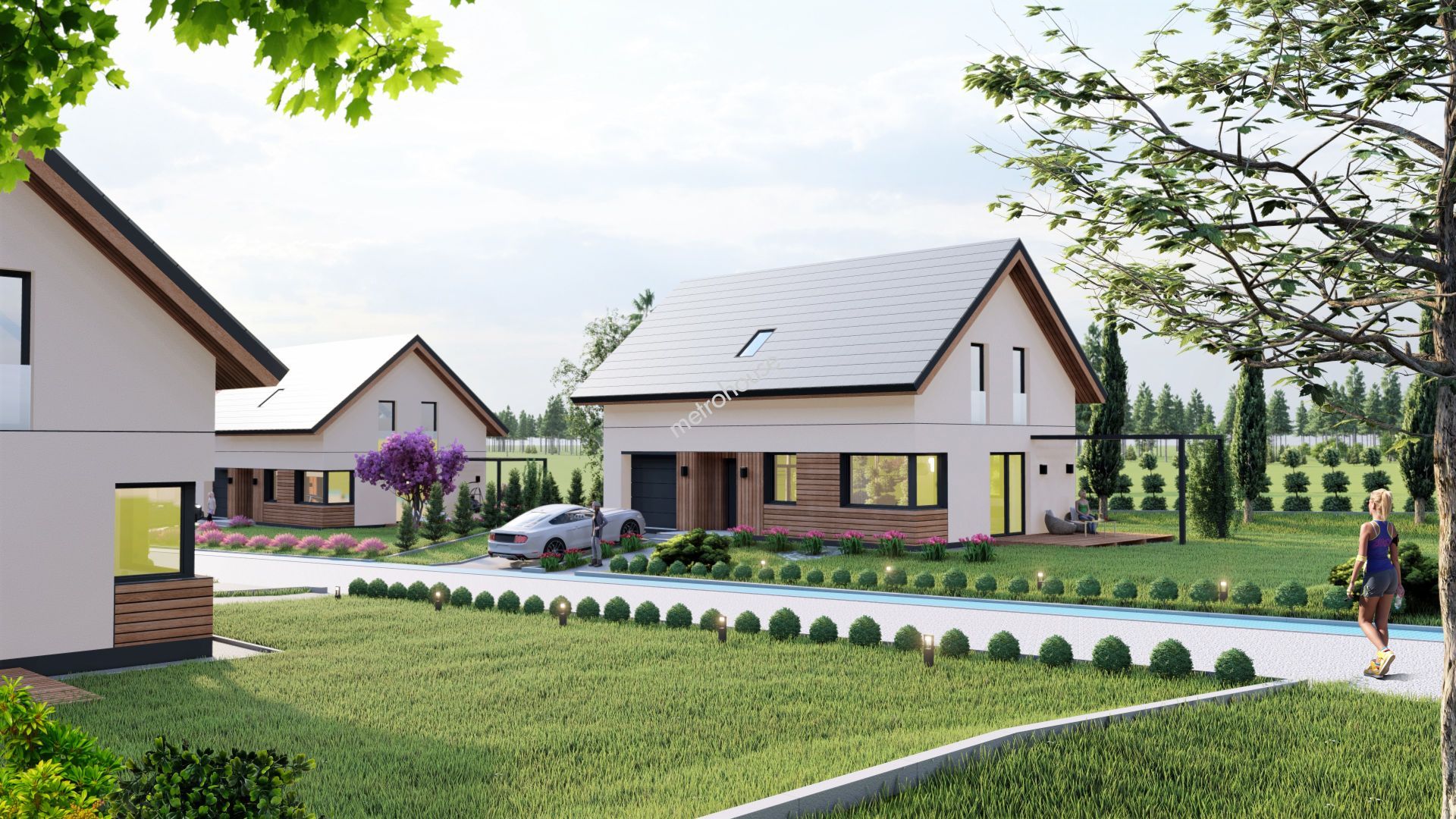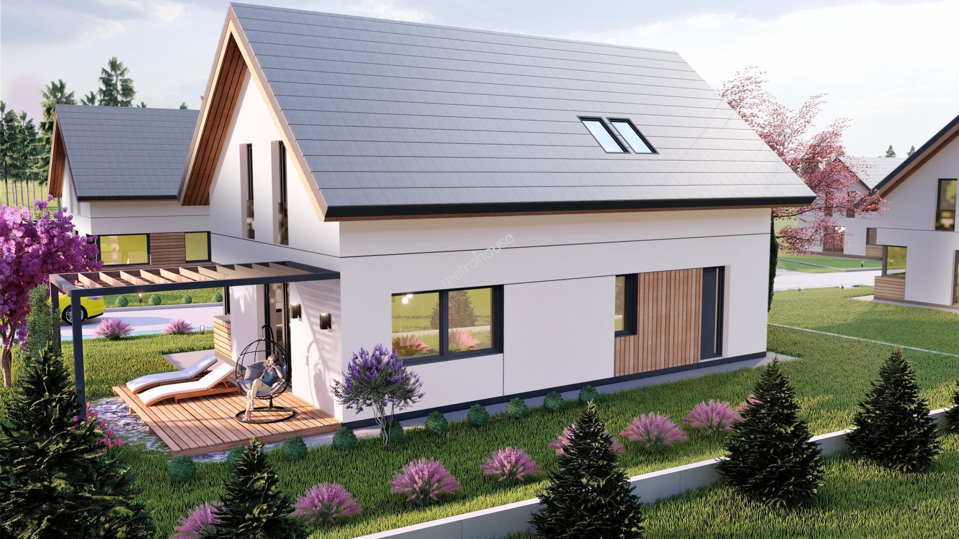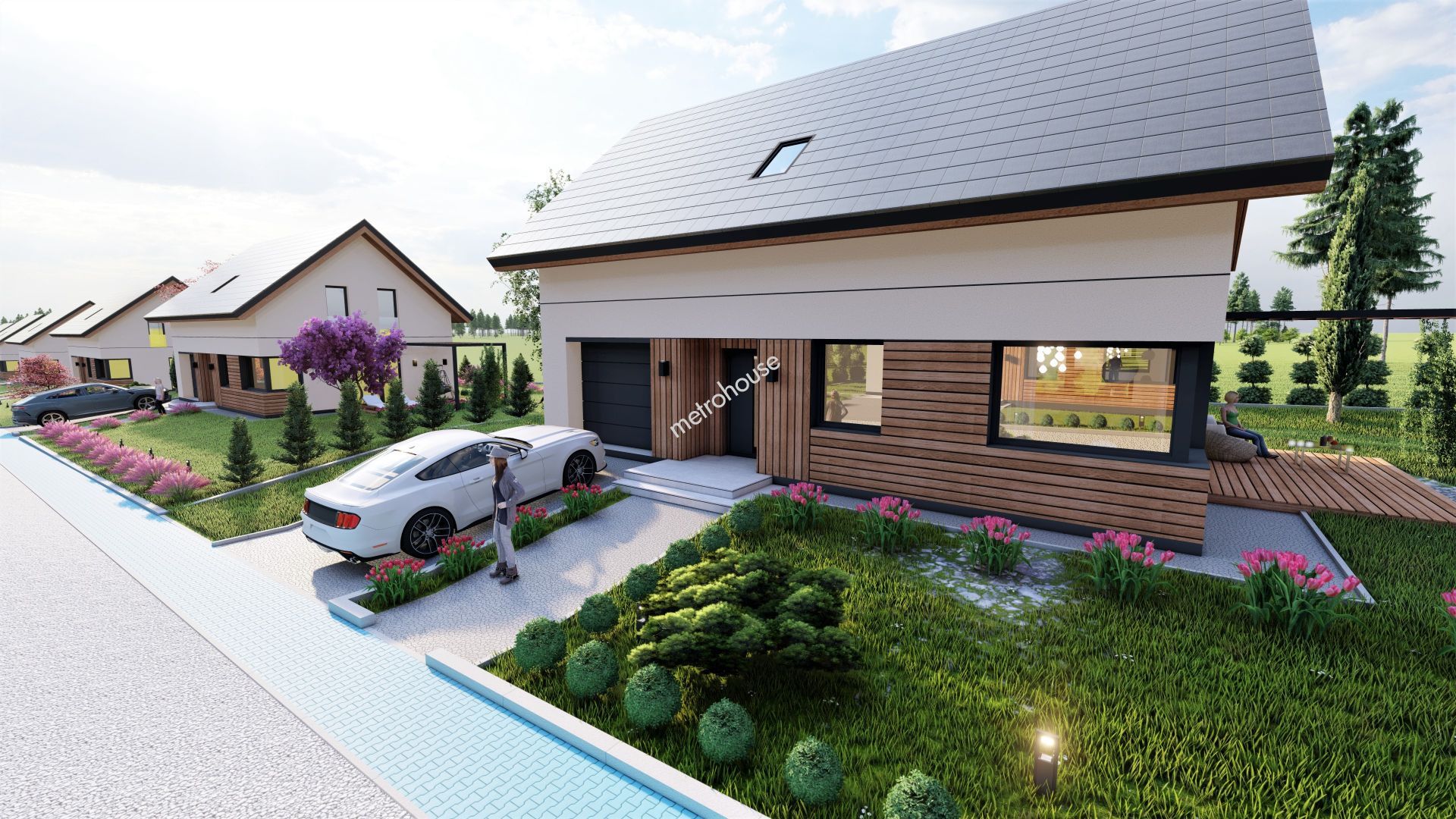 Wolnostojący dom z ogrodem i garażem w bryle budynku.