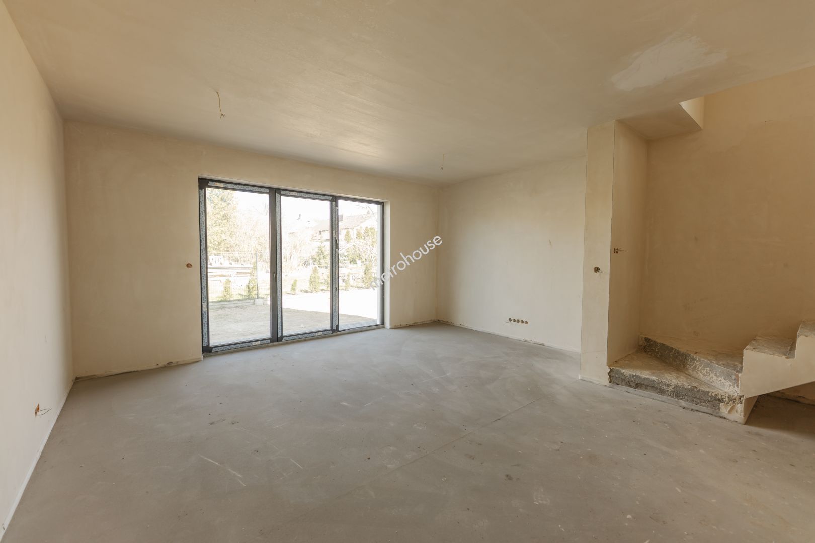 Na parterze znajduje się salon z otwartą kuchnią, WC, hol, wiatrołap, garaż.