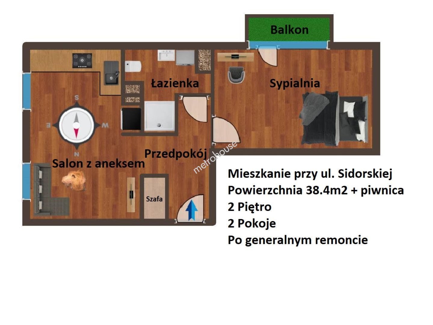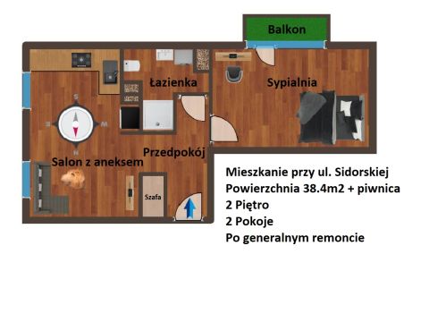 Nieruchomość posiada powierzchnię 38.4m2, znajduje się na 1 piętrze, a w jej skład wchodzą: