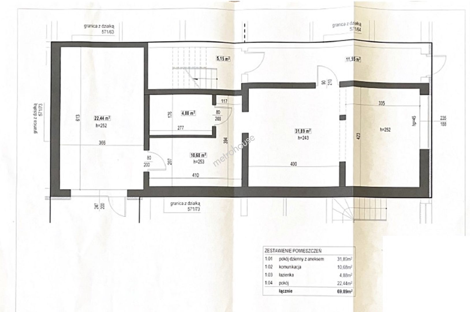 PARTER: salon z kuchnią 31,89 m2, łazienka 4,88 m2, pokój 22,44 m2, komunikacja 10,68 m2.