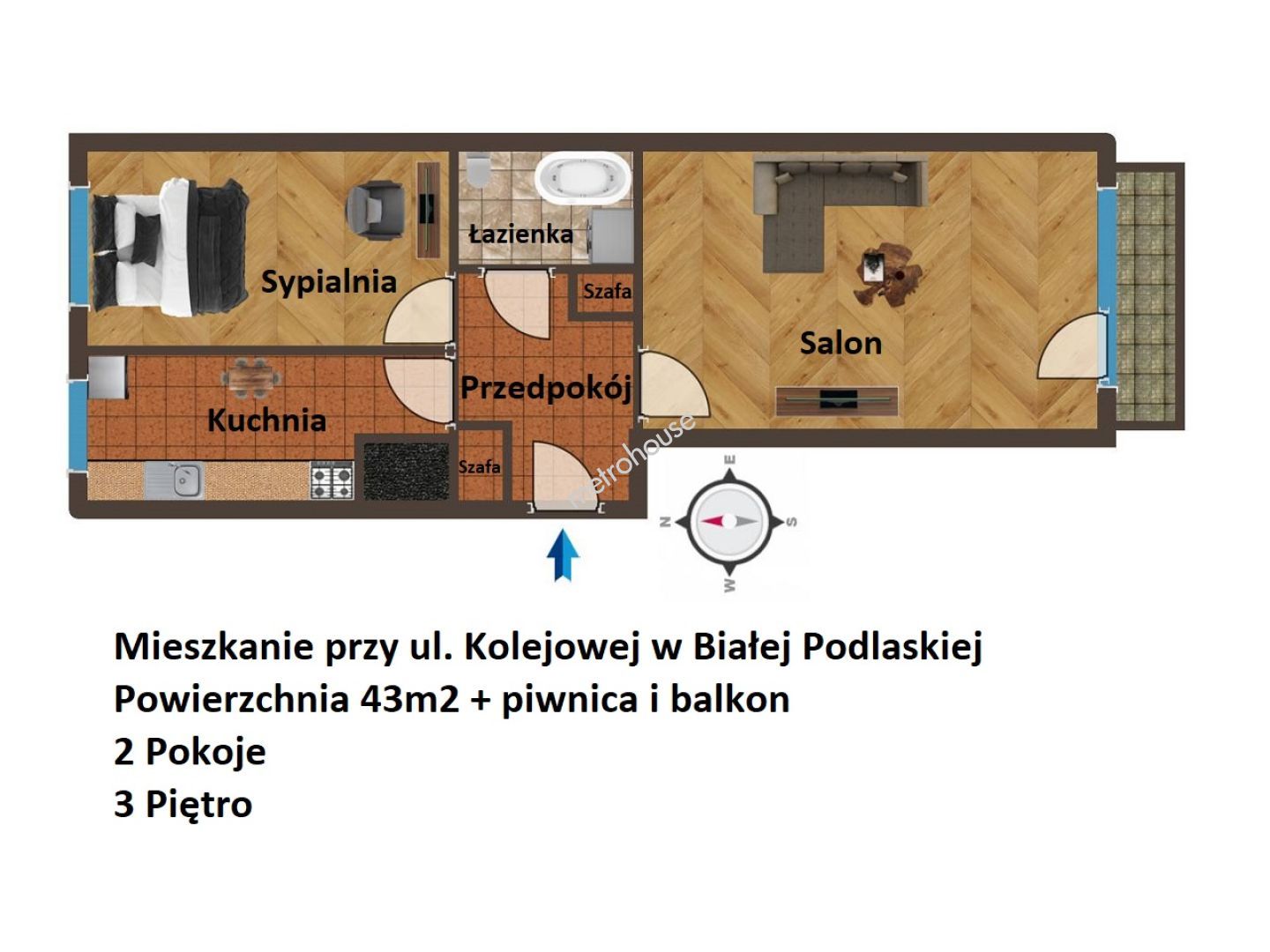 Nieruchomość o powierzchni 43m2, znajduje się na 3cim piętrze, a w jej skład wchodzą: -Salon z wyjściem na balkon -Sypialnia -Kuchnia -Łazienka -Przedpokój Do mieszkania przynależy również piwnica.