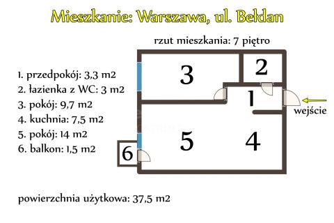 Na sprzedaż komfortowe i słoneczne mieszkanie po generalnym remoncie o powierzchni 37,5 m2, położone na 7. piętrze w zadbanym bloku z dwiema windami, przy ul. Bełdan w Warszawie (dzielnica Mokotów).