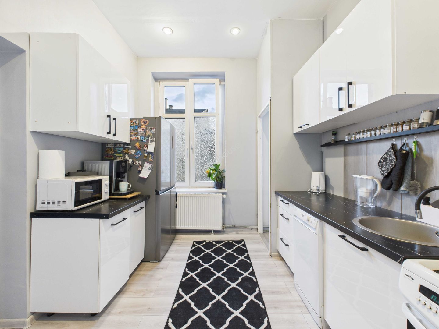 Mieszkanie jest jasne, słoneczne, ma wyjątkowy klimat, dzięki dużym, nowym oknom ze szprosami, dwuskrzydłowym drzwiom i wysokim sufitom.