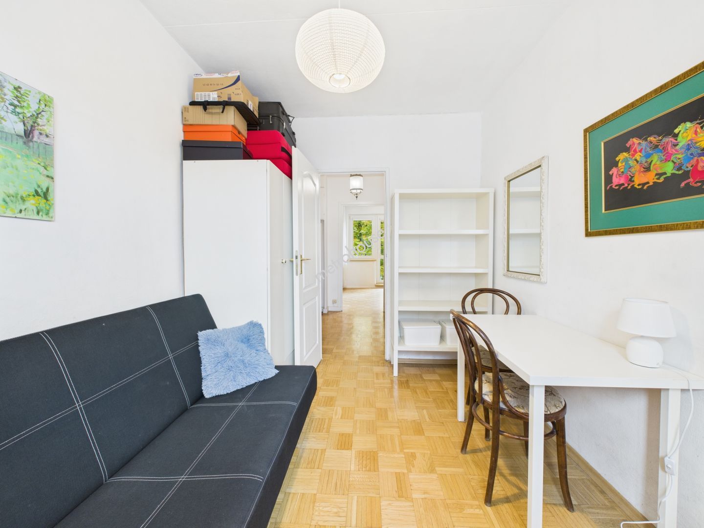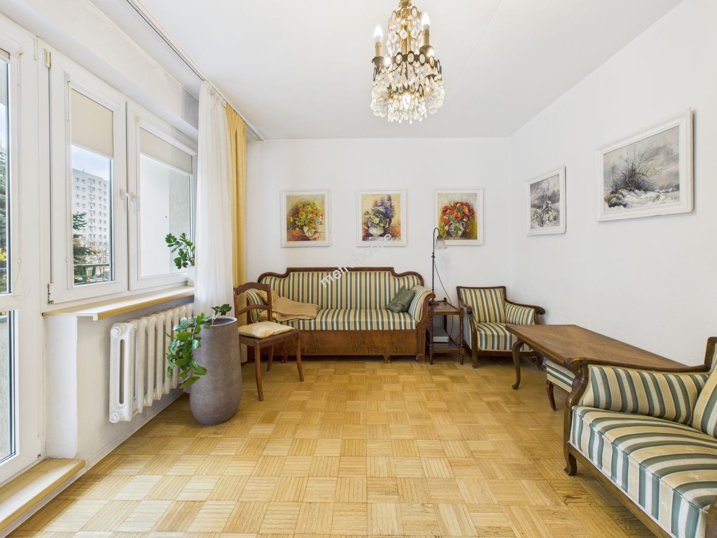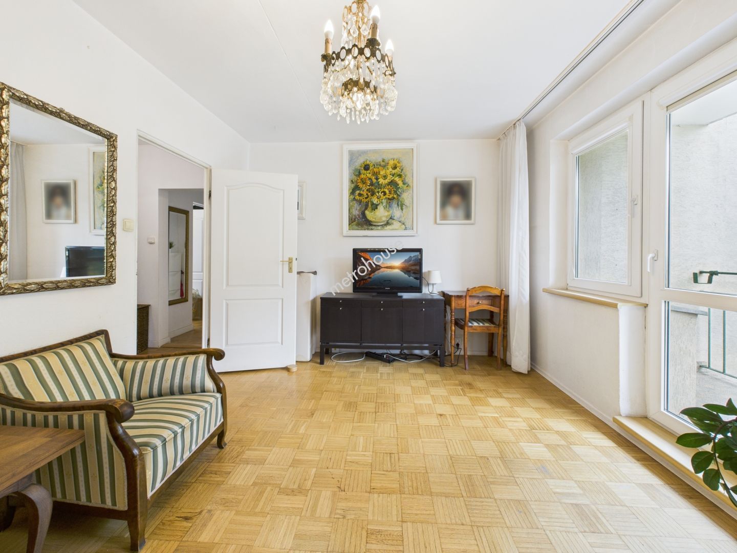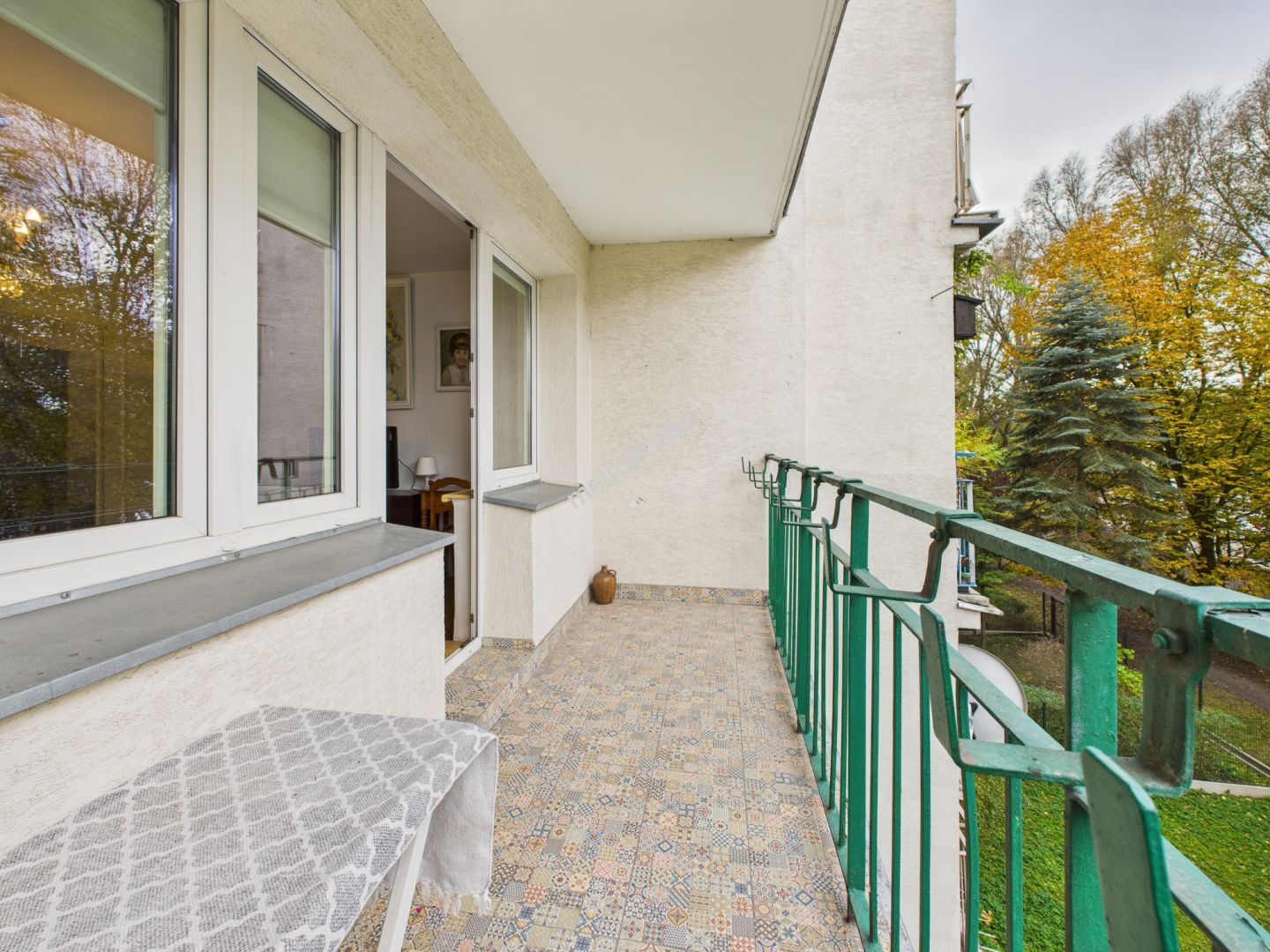 jasny salon z wyjściem na dużą loggię z widokiem na korony drzew,