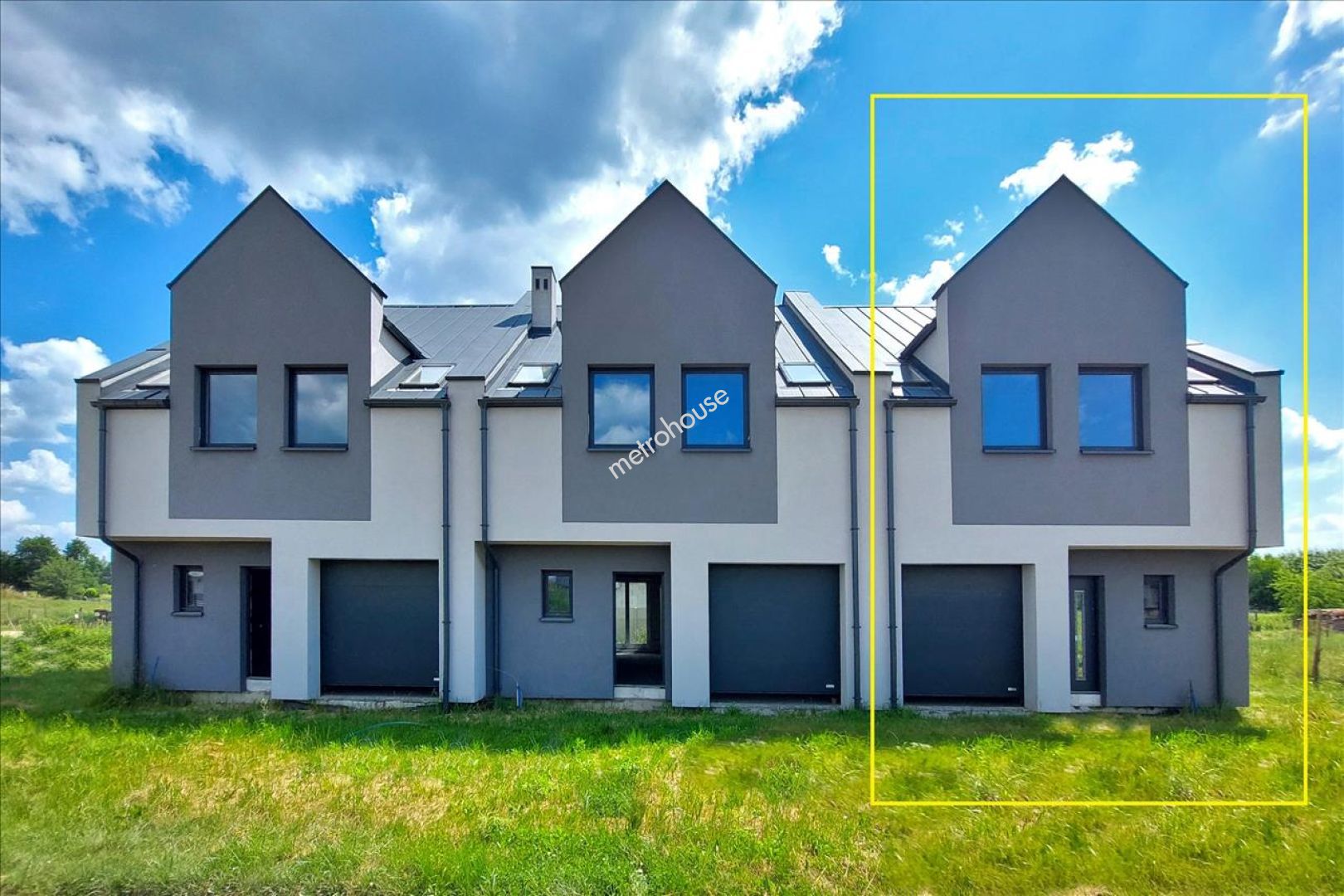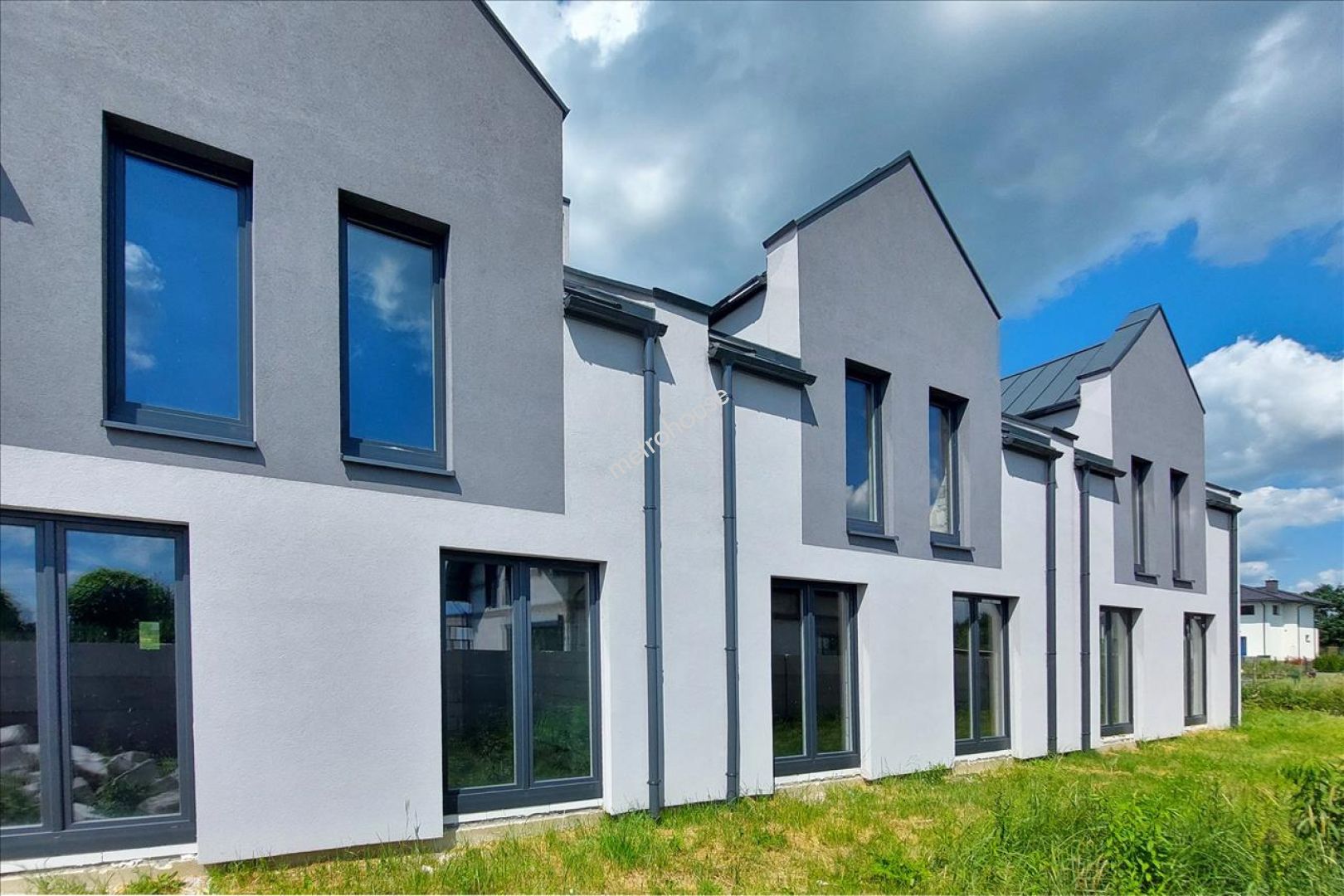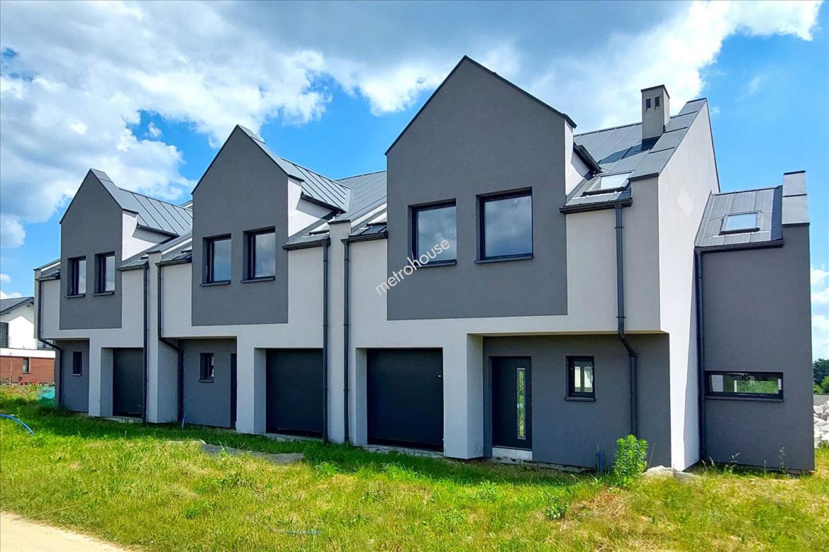 Stanowi skrajny szereg, wybudowany w technologii tradycyjnej, ocieplony i kryty blachą. Powierzchnia użytkowa 162 m2. ( w tym garaż 19 m2 w bryle budynku). Stan surowy zamknięty. Brak instalacji. Media w drodze dojazdowej.