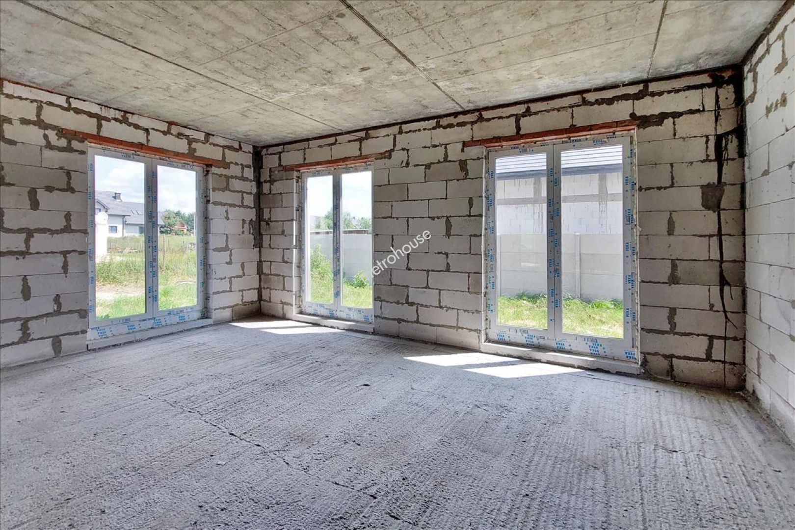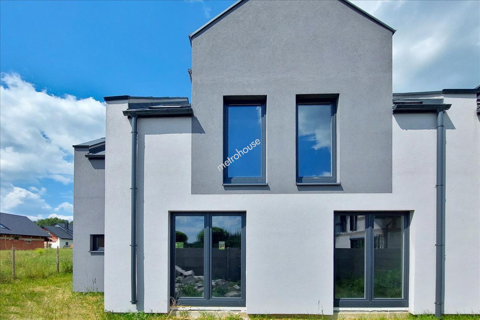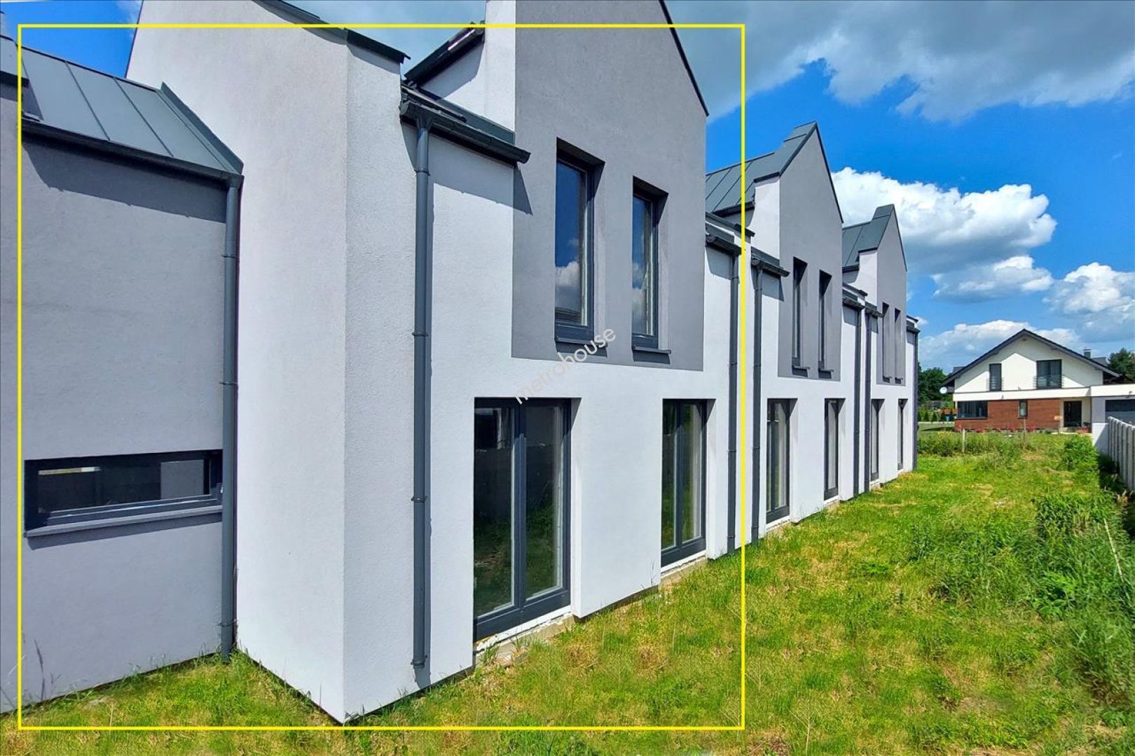 Stanowi skrajny szereg, wybudowany w technologii tradycyjnej, ocieplony i kryty blachą. Powierzchnia użytkowa 162 m2. ( w tym garaż 19 m2 w bryle budynku). Stan surowy zamknięty. Brak instalacji. Media w drodze dojazdowej.